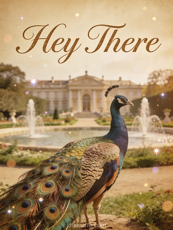 Share a beautiful hello card featuring a majestic peacock displaying colorful feathers in an elegant palace garden with fountains. Discover also a hi there yellow card, a thinking of you card or a bee hello card.