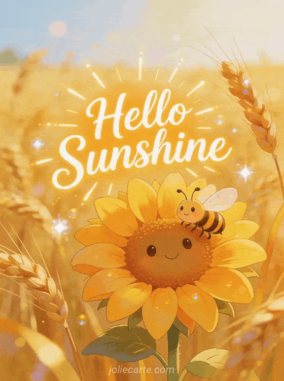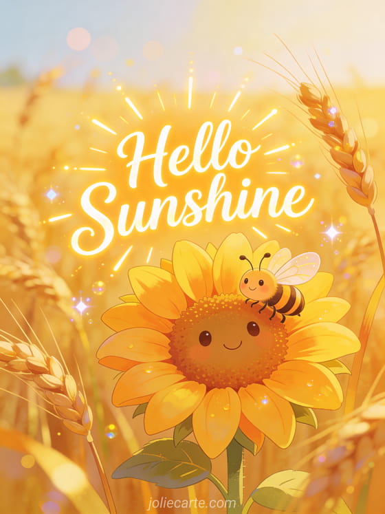 Share a beautiful hello sunshine card with a cheerful sunflower and a smiling bee in a bright summer field with golden wheat. Discover also a sweet hello card, a hello photos card or a hey good morning funny card.