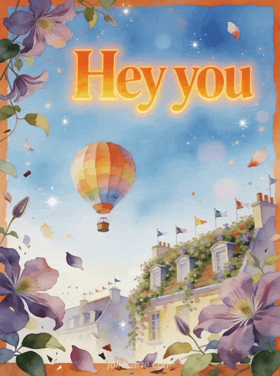 Send a bright hey you gif card with a colorful hot air balloon drifting above clematis-covered rooftops. Discover also a hi good day gif, a hi there good morning images or a hello hi there gif.