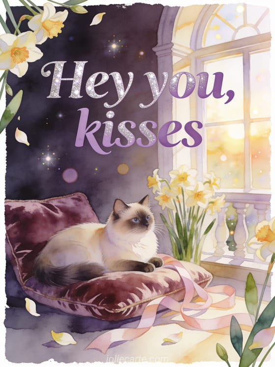 Share a soft hello with lilac watercolor lettering, a Birman cat on a velvet cushion, daffodil blooms, pastel ribbons, and a sunlit bay window. Discover also a hi there kitten, a a sweet little hello kisses card, or a hi good morning everyone greeting.