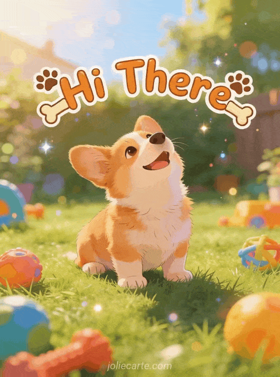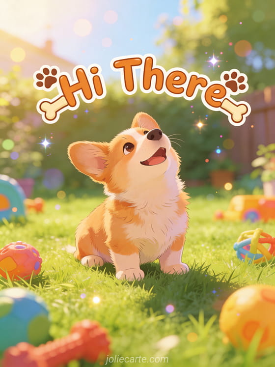 Hi there a joyful and sunny hi card featuring an adorable corgi puppy with a tilted head