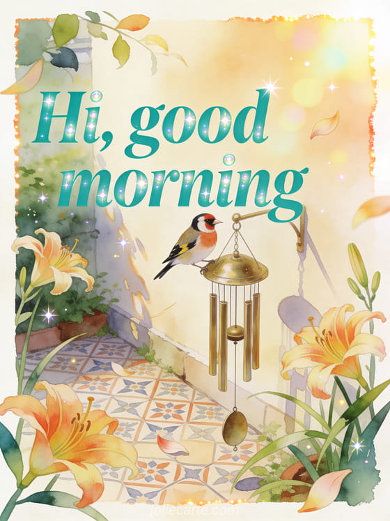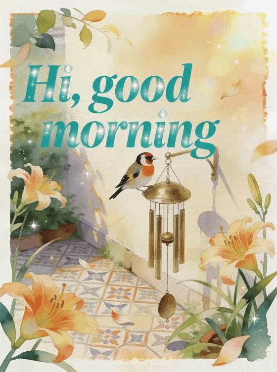 Send a cheerful morning hello with teal lettering, daylilies, a bullfinch and a soft musical sparkle in a breezy garden corner. Discover also a hi there kisses animated gif, a hi good day gifs or hello photos.