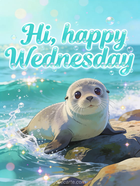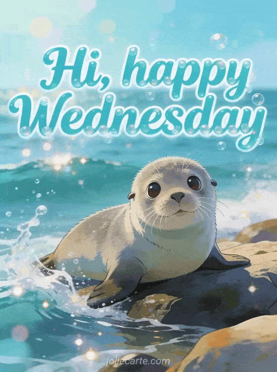 Send a cute happy Wednesday greeting with a curious baby seal resting on rocks by the ocean, waves splashing and water droplets sparkling in the sun. Discover also good morning it's Wednesday gif, animated happy Wednesday or happy Wednesday mountain.