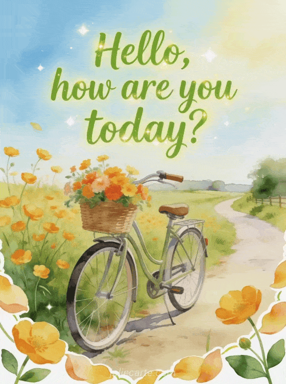 Send a bright check-in with green watercolor lettering, buttercups, a vintage bicycle with a basket of blooms, fresh daylight, and a country lane. Discover also a good evening my darling how are you card, a hello how are you today card, or an are you okay my love card.