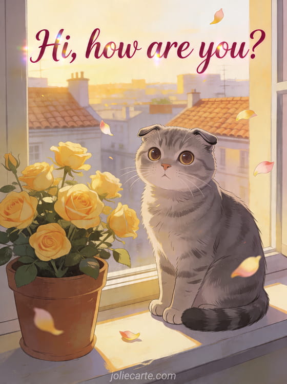 Reach out with tenderness using this delicate card showing a gray Scottish Fold cat on a windowsill beside yellow roses in warm late-afternoon light. You can also discover hey how's it going, good morning how are you or how are you.