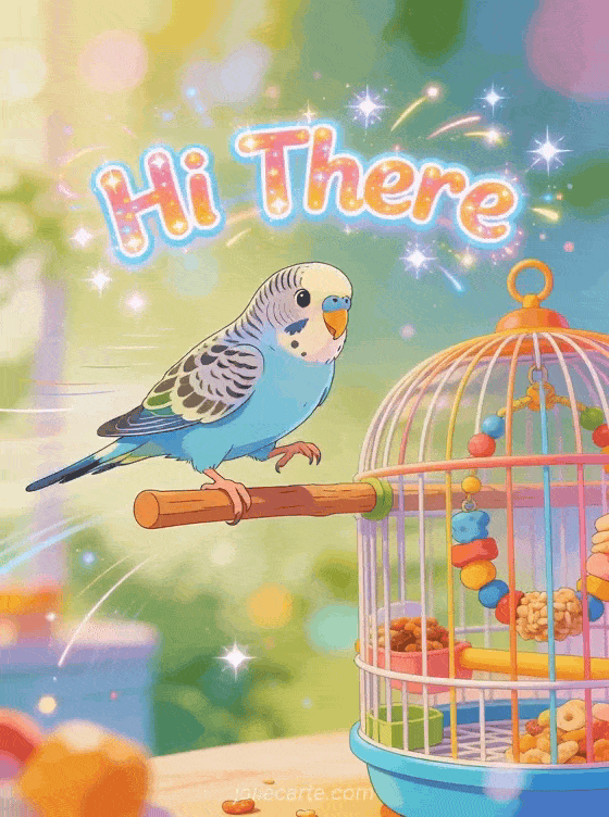 Send this fun animated hi with a playful budgie parakeet hopping on its perch. Perfect for a cheerful hello. Discover also a hey good morning gif card or a little hello kisses card.