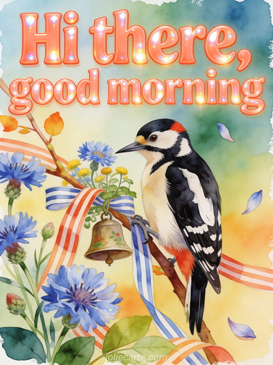 Share a joyful morning greeting with this watercolor card, featuring a great spotted woodpecker near a small garden bell among cornflowers and striped ribbons. Discover also hey good evening png, good morning and hello, or oh hello.