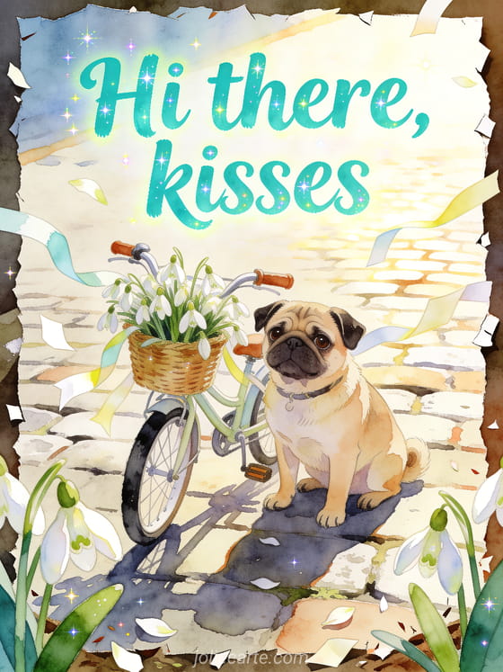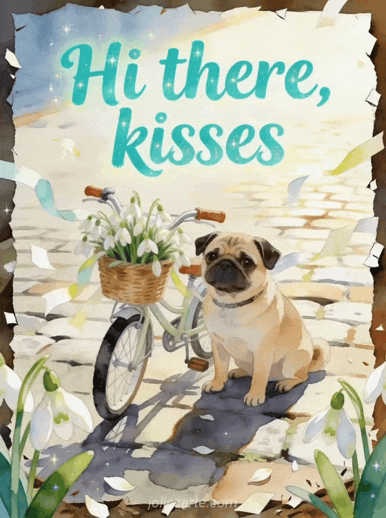 Share a bright card with turquoise lettering, a pug beside a tiny bicycle basket overflowing with snowdrops, paper streamers and sunlit cobblestones. You can also send hi good day gifs, beautiful hi there good morning images or hello gif.