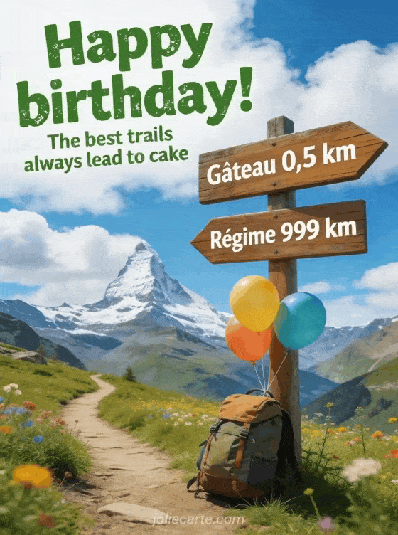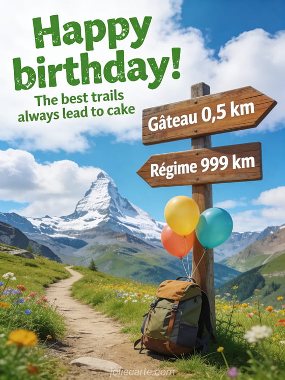 Make the birthday hiker laugh with this trail sign pointing to Cake 0.5 km in an alpine meadow with a backpack and birthday balloons. Discover also a boy happy birthday humor card or a funny happy birthday dog card.