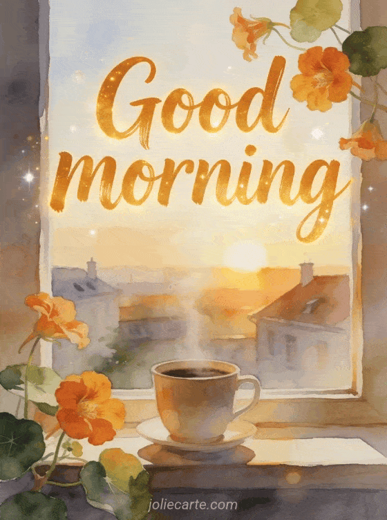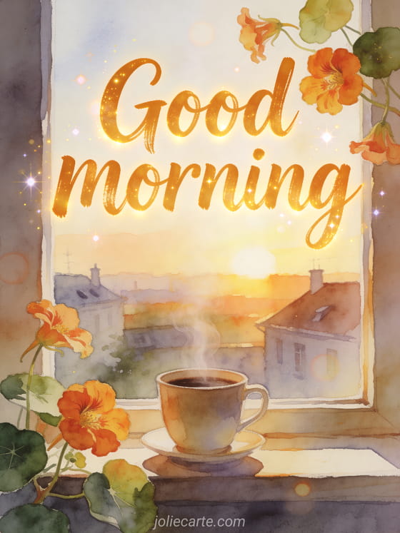 Start the day with warm amber watercolor lettering, a steaming coffee cup on a windowsill, nasturtium petals over the border, and sunrise light above distant rooftops. Discover also a good morning and good coffee image, a good morning coffee gif coffee card, or a good morning coffee flowers image greeting.