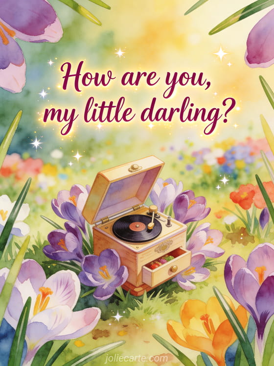 Ask tenderly with plum watercolor script, crocus flowers around a tiny music box, fresh spring garden colors, soft golden light, and scattered star glints. Discover also a how are you my son card, a hello my love how are you card, or a how is my little darling card.