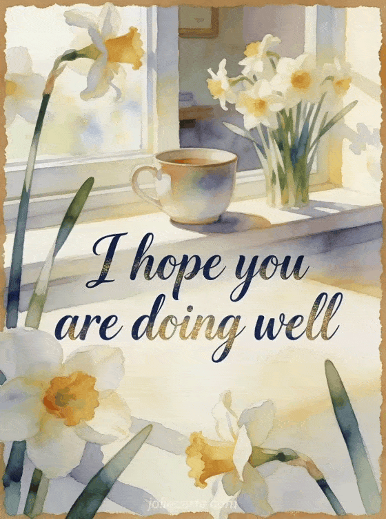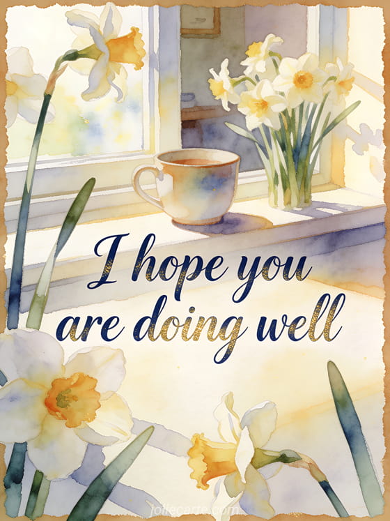 Send a refined caring message with navy watercolor script, a ceramic cup, fresh daffodils, and a calm sunlit window ledge in the morning. Discover also a hello friends how are you, a how is my grandson card, or a hi my darling how are you greeting.