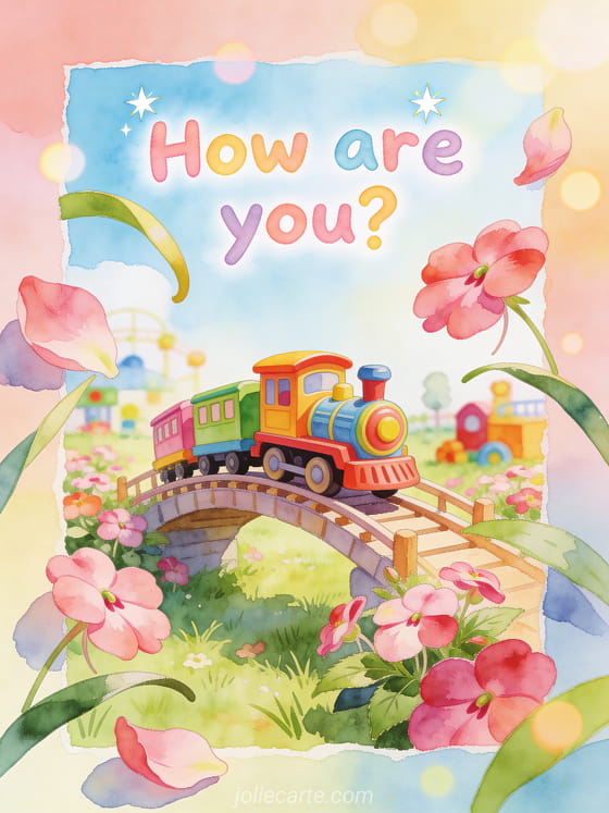 Send a playful greeting with rounded watercolor letters, a colorful toy train crossing a small meadow bridge, and impatiens petals bursting over the border. Discover also a hi my darling how are you, a how are you my daughter card, or a how is my sweetheart greeting.