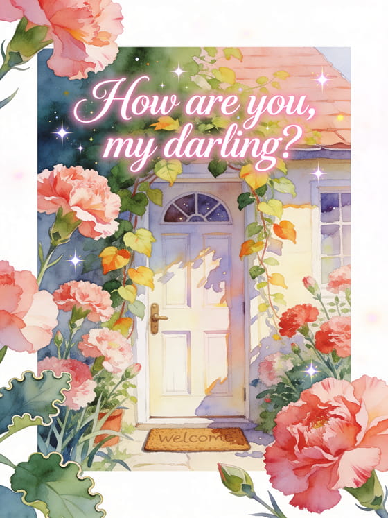 Ask with tenderness through graceful pink watercolor lettering, carnations around a painted cottage door, climbing leaves, and a small welcome mat in daylight. Discover also a hi how are you today, a good evening my darling how are you card, or a hello how are you today greeting.
