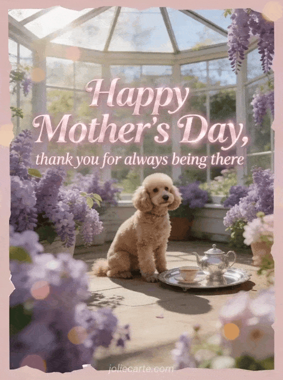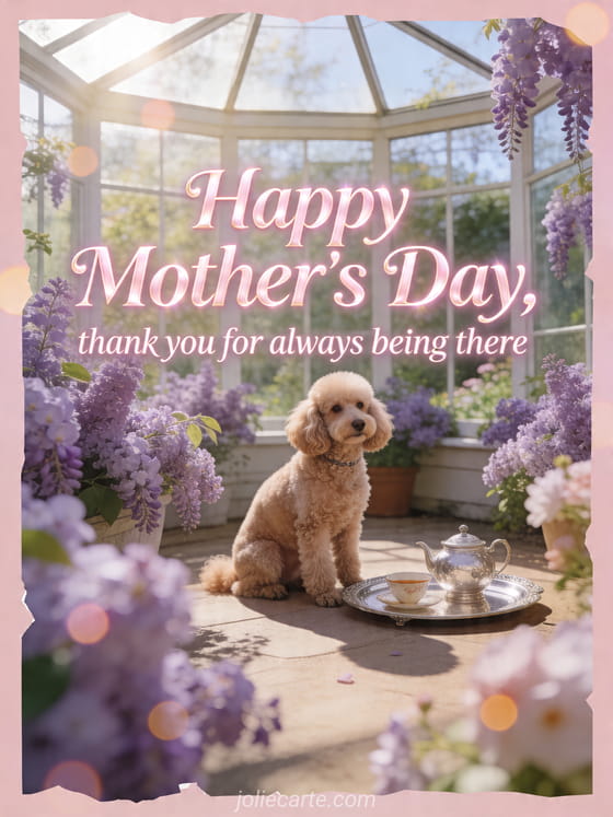 Thank Mom with a bright card showing a photorealistic poodle in a lilac-filled conservatory beside a silver tea tray. You can also send Mother's Day photo, a Mother's Day poem or Mother's Day poetry.