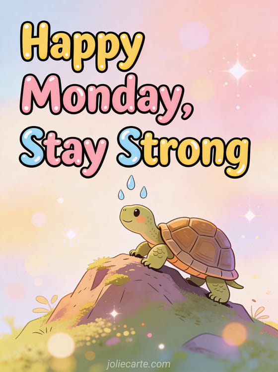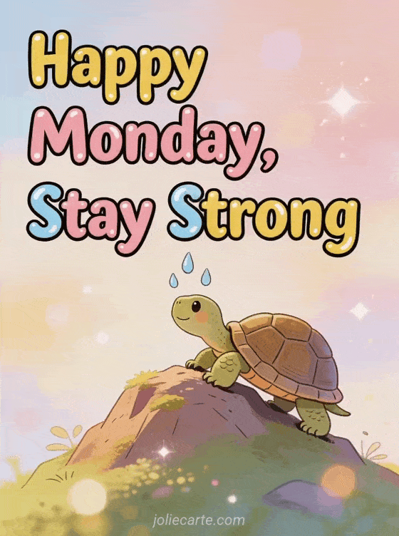 Start the week with a smile thanks to this humorous happy Monday card featuring a determined turtle climbing a tiny mountain. Discover also a happy Monday big kisses card or a positive happy Monday card.