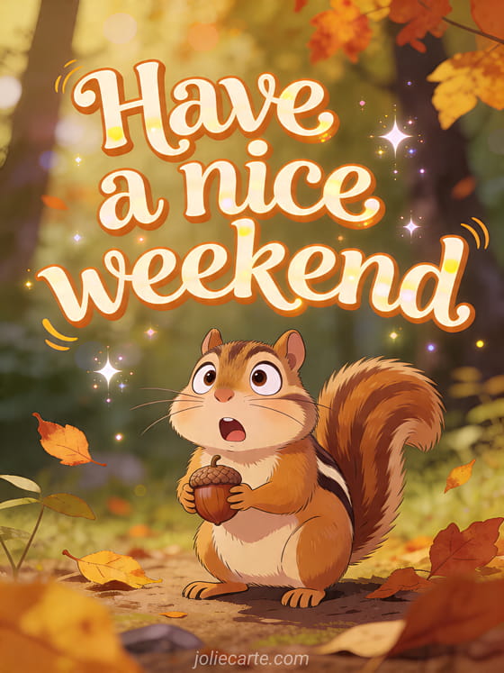 Share this funny have a nice weekend card with a dramatic squirrel, a big acorn, and hilarious surprised eyes. You can also discover sunny have a nice weekend humor, wish a nice weekend with humor and animated have a nice weekend gif.