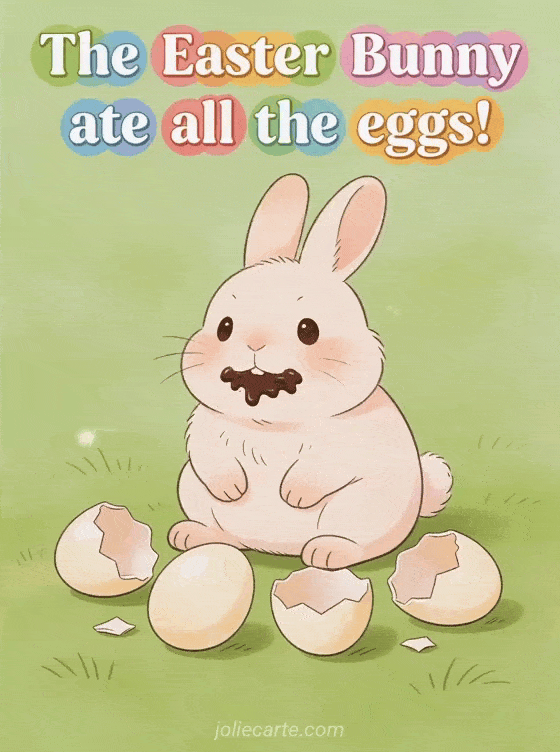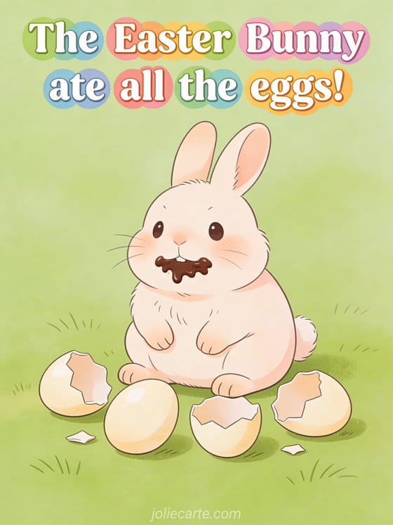 Send a hilarious Easter greeting featuring a chubby bunny caught red-handed after eating all the eggs. Discover also a funny Easter image or a humorous Easter greeting and a funny happy Easter card.