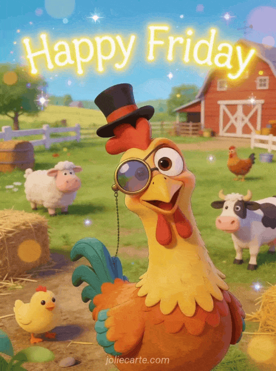 Share a laugh this Friday with this hilarious chicken in a top hat greeting card. Discover also a happy friday photo card or a happy friday kisses tenderness card.