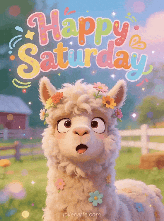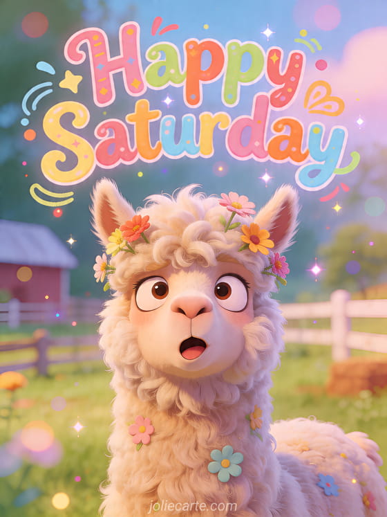 Share a funny Happy Saturday greeting with this free card showing a fluffy alpaca making a goofy face with flowers in its wool on a pastel farm background. You can also discover good morning and happy saturday, happy saturday humor gif or happy saturday animated gif.