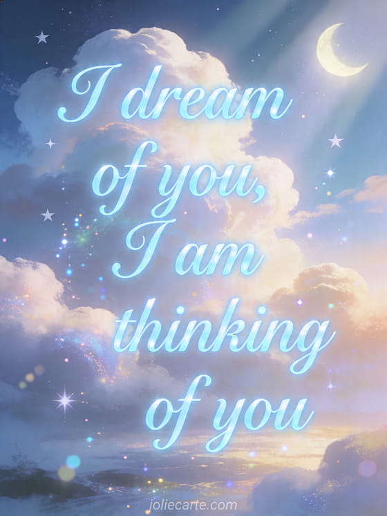 Share a dreamlike card to say that you dream of someone and keep thinking about them. You can also explore good day my love i am thinking of you, i am thinking of you i love you or photo I love you thinking of you.