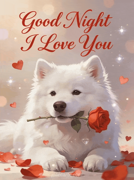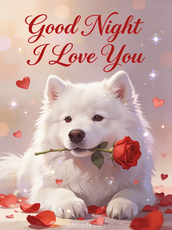 Send this romantic good night card featuring a fluffy white Samoyed dog with a loving expression holding a red rose in its mouth in a dreamy atmosphere with sparkling light particles. A sweet way to say good night to your sweetheart. Discover also a good night love animated card or a romantic good night card.