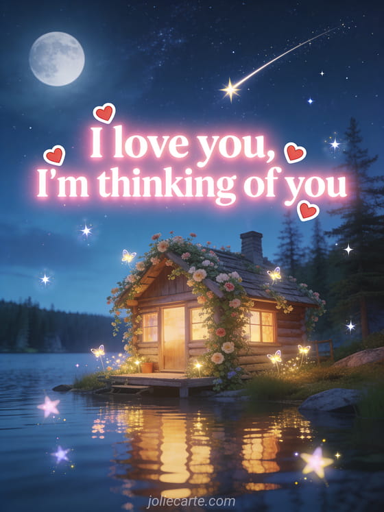 Express your love with this beautiful card featuring a charming cabin by a lake surrounded by hearts. A tender message to tell someone special you're thinking of them. Discover also a I love you thinking of you card or a thinking of you with kisses card.