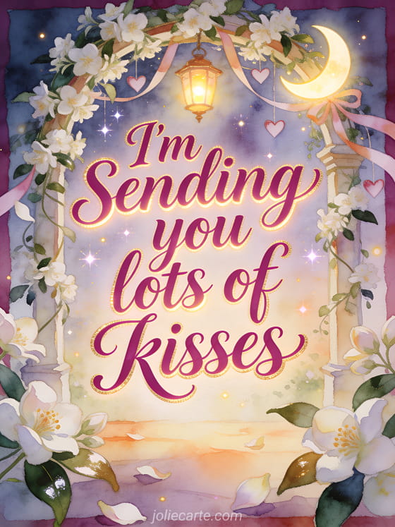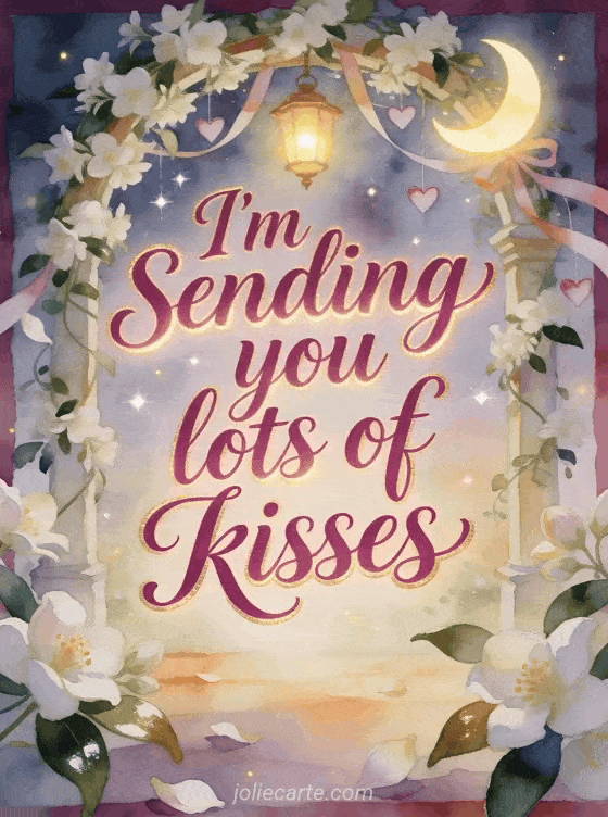 Send lots of kisses in a magical watercolor jasmine arbor, with a glowing crescent moon lamp, heart ribbons and sparkling warm light. Discover also sending kisses gif, rain of kisses images or animal kisses gif.