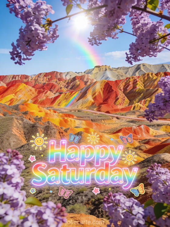 Share a spectacular happy saturday card with luminous rainbow lettering, radiant sun stickers, colorful butterflies, the striped red, orange and yellow mountains of Zhangye Danxia and purple lilac branches in the foreground. See also happy spring saturday, beautiful day happy saturday kisses or this good morning saturday card.