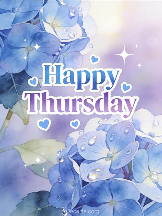 Wish a happy Thursday with refined blue hydrangeas, crystalline dew, delicate blue hearts and a soft lavender pastel background. Discover also Thursday kisses images, happy Thursday big kisses gif or Thursday kisses gifs.