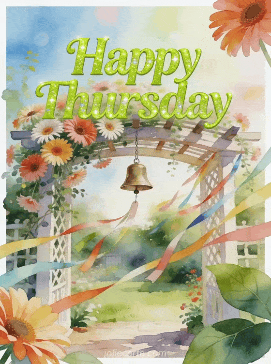 Send images for happy Thursday with lime green lettering, a garden pergola, gerbera blooms, a brass wind chime and colorful ribbons in the breeze. Discover also a happy thursday poem, happy Thursday blessing or a Thursday good day gif.