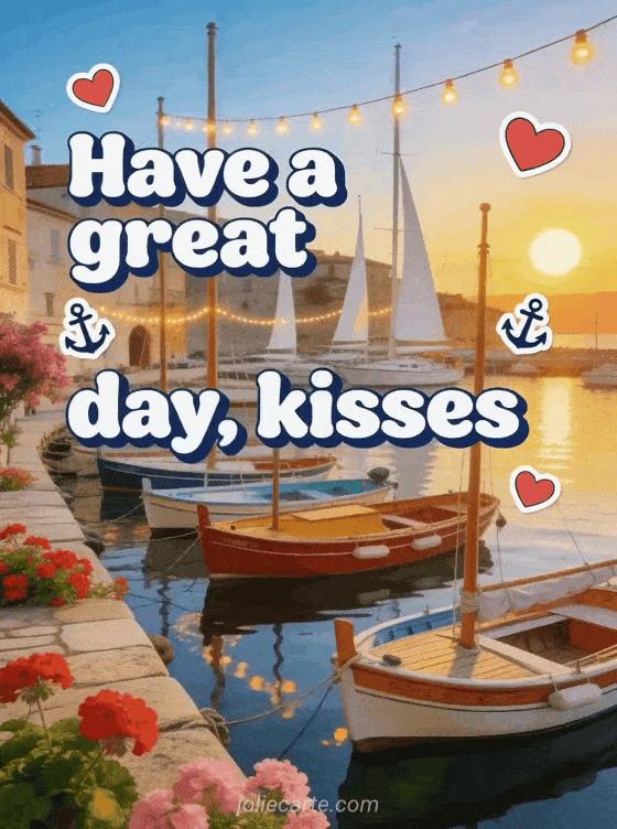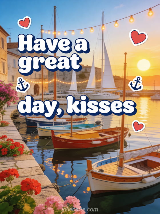 Brighten someone's day with this charming Mediterranean card featuring a picturesque harbor with colorful sailboats, red geraniums, bougainvillea and string lights between the masts. Discover also a have a nice day kisses card or a good morning animated card.