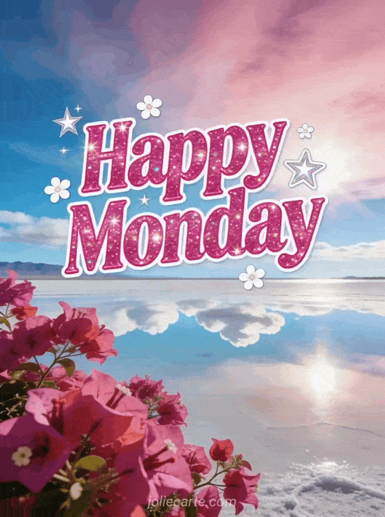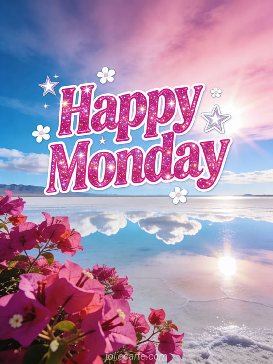 Share a spectacular happy monday card with vibrant fuchsia glitter lettering, sparkling stars, small white flowers, bright bougainvillea in the foreground and the Salar de Uyuni reflecting clouds in a pink and blue sky. See also happy monday and good week quote gif, happy monday landscape gif or this free happy monday image.