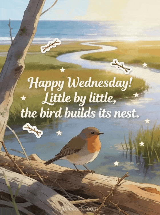 Happy Wednesday! Little by little, the bird builds its nest. a peaceful midweek quote inspired by nature