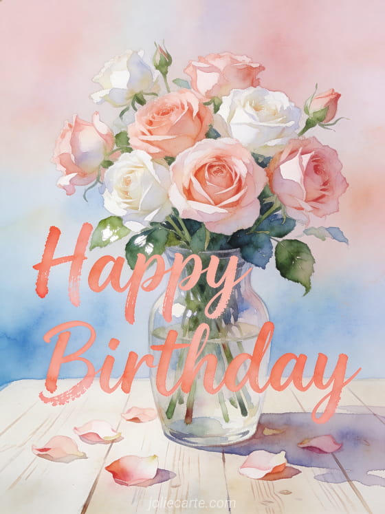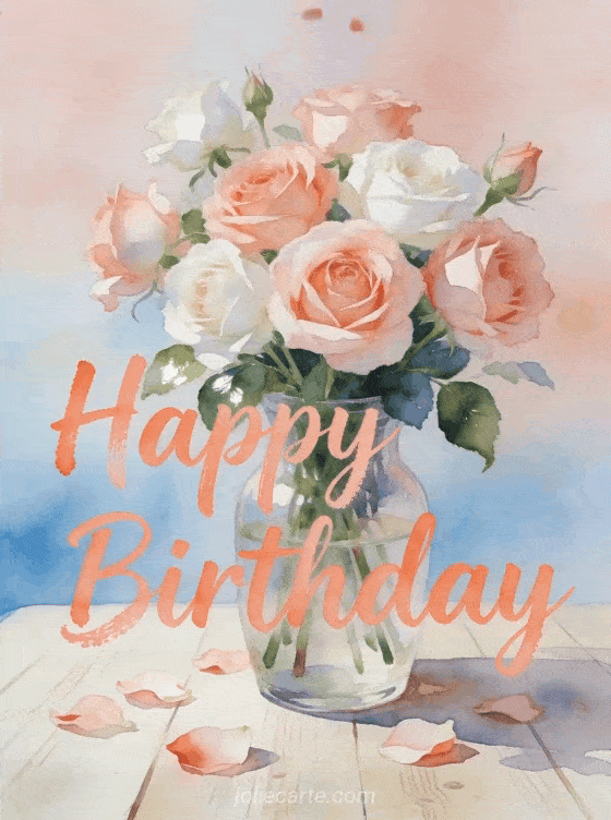 Send this elegant JolieCarte animated birthday card with pink and white English roses in a glass vase, scattered petals on a light wooden table. Discover also a happy birthday animated image or a birthday card animated gif free.