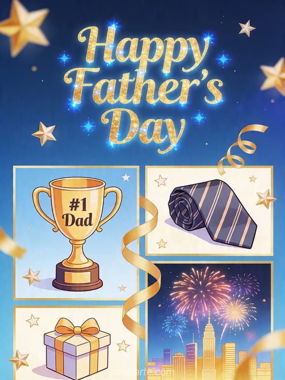 Celebrate Dad with a vibrant illustrated Father's Day card featuring a trophy mug, folded tie, gift box and bright city skyline under fireworks. This festive design brings energy and joy to the day. Discover also a father's day tie card, happy Father's Day dad card or Father's Day sweet words.