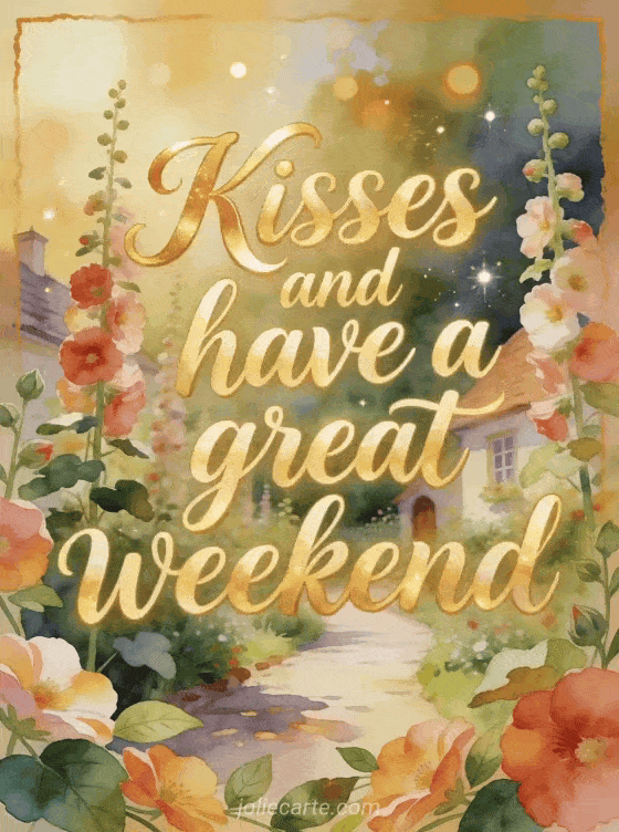 Wish a bright weekend with flowing watercolor lettering, hollyhock blossoms crossing the border and a cheerful cottage garden path. You can also send kisses good weekend image, kisses beautiful images great weekend or good weekend kisses card.