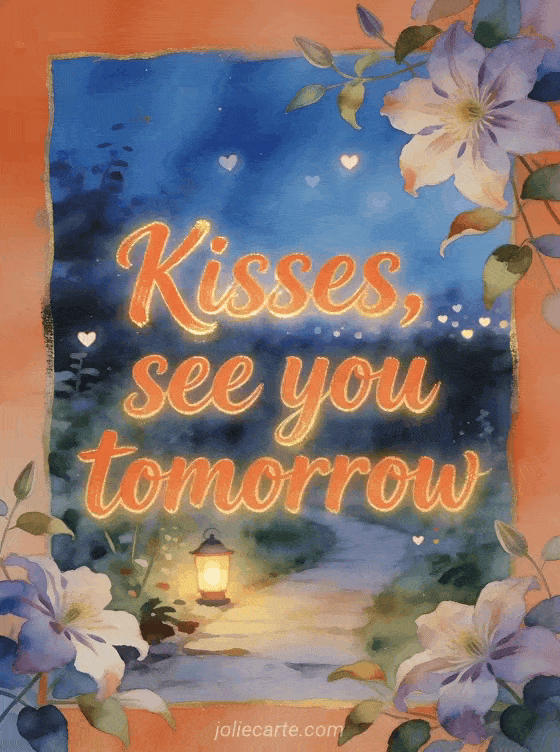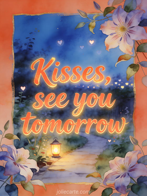 Share a warm goodbye with coral watercolor lettering, clematis blossoms, a cozy twilight garden path, a small glowing lantern, and heart-shaped light specks. Discover also an animated kisses see you tomorrow, a lots of kisses see you tomorrow gif card, or a see you tomorrow kisses animated gif greeting.