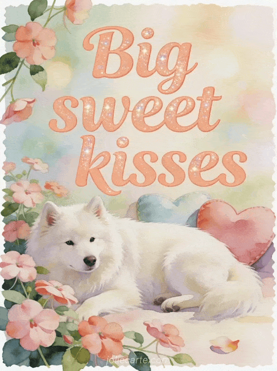 Send big sweet kisses with a fluffy samoyed, soft cushions and impatiens flowers in a joyful watercolor scene. Discover also a lots of kisses cat gif, a lots of kisses image or little kisses.