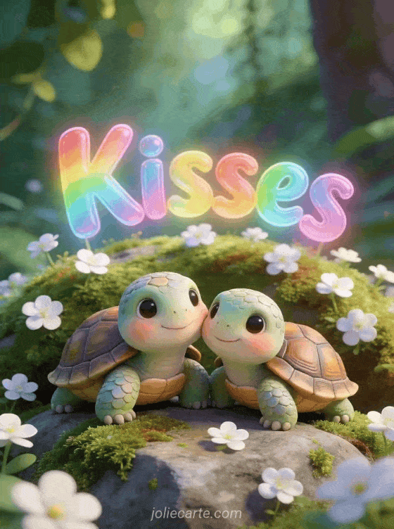 Send sweet kisses with this free clipart card featuring an adorable couple of cute turtles side by side on a mossy rock with soft woodland light. Discover also a sending kisses image card or a kisses and coffee image card.