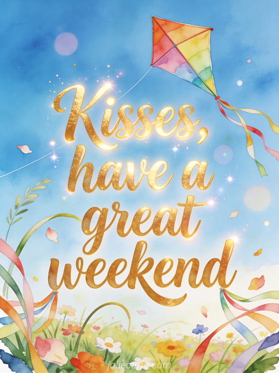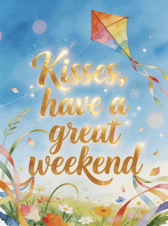 Share a carefree weekend feeling with a colorful kite over a flowered meadow, curved grasses, drifting petals and ribbon tails in bright watercolor sky. You can also send big kisses good weekend, great weekend animated kisses or great weekend lots of kisses.