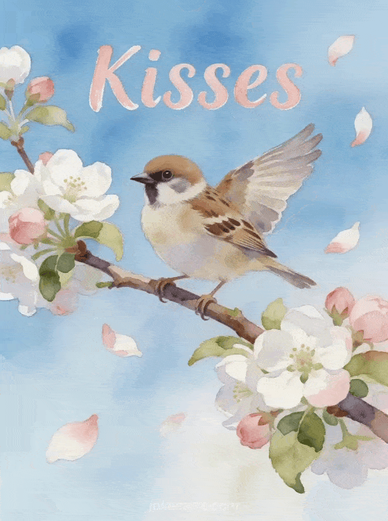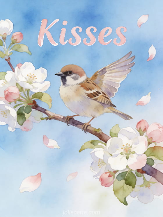 Send tender kisses with this delicate watercolor card featuring a cute sparrow perched on a blooming apple tree branch. Discover also sms full of kisses or wet kisses.