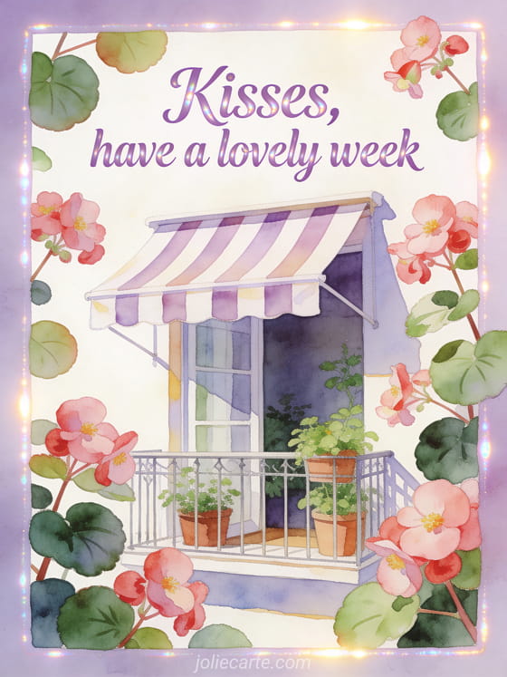 Wish a lovely week with smooth lavender watercolor lettering, begonia blossoms, rounded leaves, a bright balcony, striped awning, potted greenery, and warm relaxed light. Discover also a lovely week kisses gif card, a great week kisses photo card, or a very beautiful week kisses card.