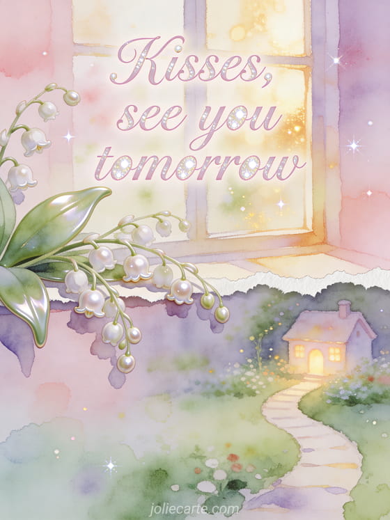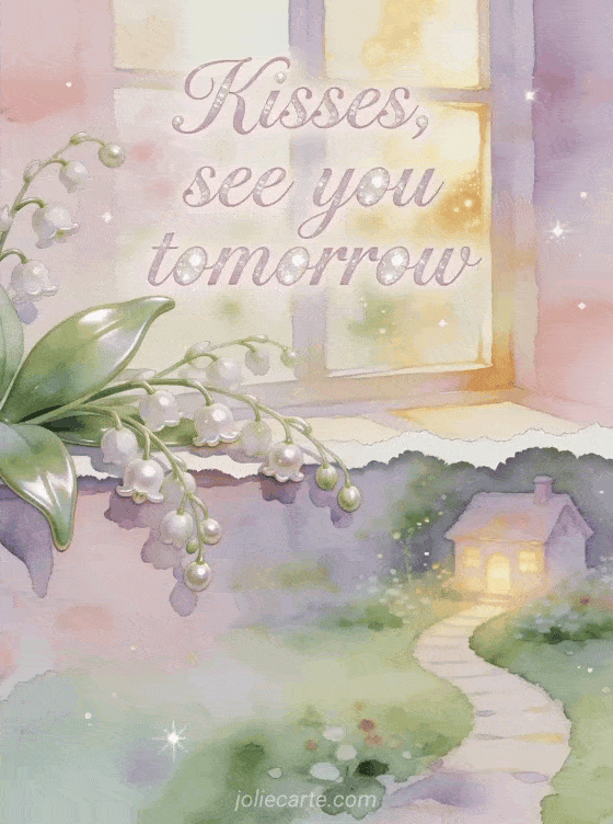 Share a gentle farewell with pearly watercolor calligraphy, lily of the valley bells over the border and a tiny cottage glowing beside a garden path. You can also send see you tomorrow kisses, ok kisses see you tomorrow or see you tonight kisses.