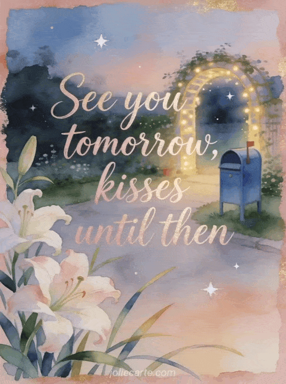Send a reassuring kisses until tomorrow card with sweeping rose-gold watercolor lettering, lilies and slender leaves, a blue mailbox beside a glowing garden arch and hopeful evening light. You can also share picture see you tomorrow kisses, good evening see you tomorrow kisses or good evening and good night kisses see you tomorrow.