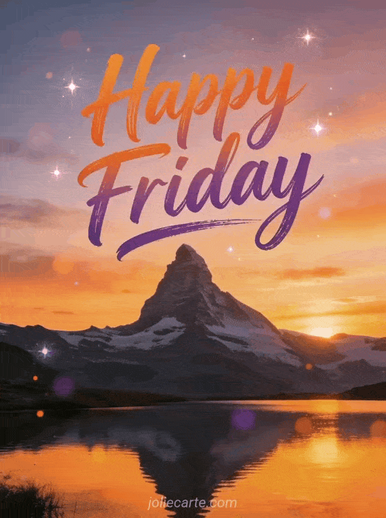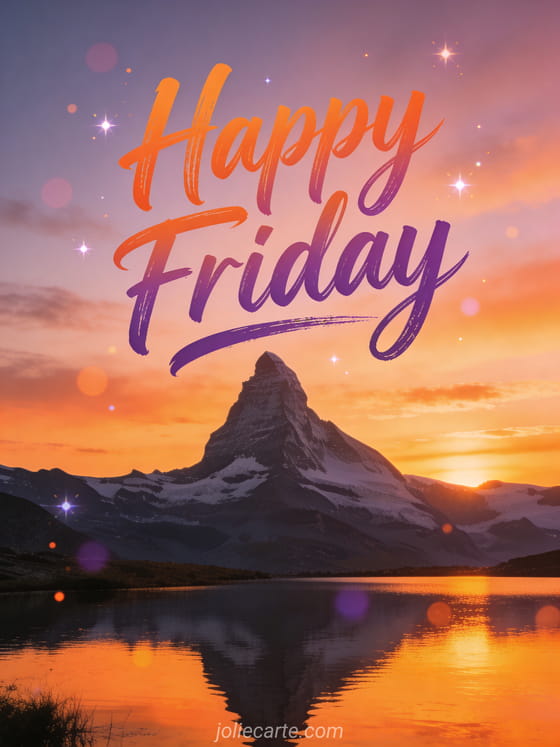 Share a breathtaking happy friday greeting with artistic orange and purple calligraphy, a mountain silhouette at sunset and a calm lake reflecting the orange sky. Discover also an animated happy friday card, a happy friday everyone gif or a funny happy friday humor card.