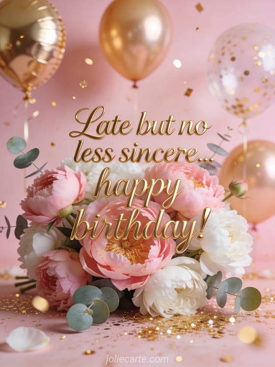 Say sorry for a missed birthday with this elegant late birthday image full of sincerity and good wishes. Discover also a wishing happy birthday late card, a late birthday cat card or another wishing happy birthday late card.