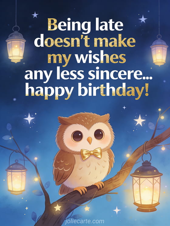 Share a warm belated birthday message with someone you care about. Discover also a belated birthday funny card or a belated birthday man card.