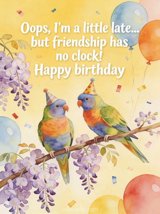 Send this warm belated birthday card to a friend and prove that friendship knows no clock. Discover also a late happy birthday message or a belated birthday funny card.