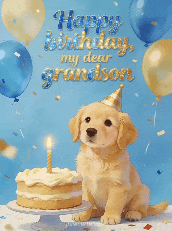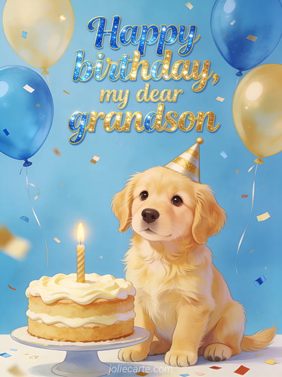 Send a tender birthday greeting to your dear grandson with an adorable golden retriever puppy in a party hat, a cake with one candle, balloons and confetti. Discover also a happy birthday my grandson, a wish your grandson a happy birthday or a wish my grandson a happy birthday.
